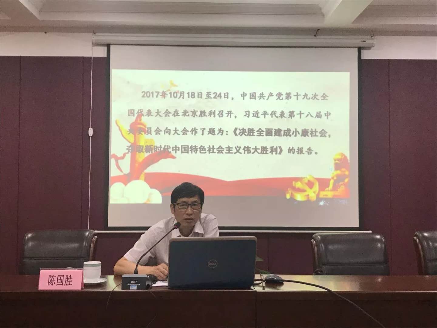 陈国胜宣讲以《了解新形势、牢记新使命、把握新方向,建设新时代中国特色社会主义》为主题,紧紧围绕党的十九大精神,从党的十九大的主题和主要成果、习近平新时代中国特色社会主义思想方面,对党的十九大精神进行了全面深入的讲解。宣讲主题鲜明、内容丰富,对与会人员深刻理解、准确把握党的十九大精神实质,具有很强的指导作用。精彩的宣讲赢得现场热烈的掌声。